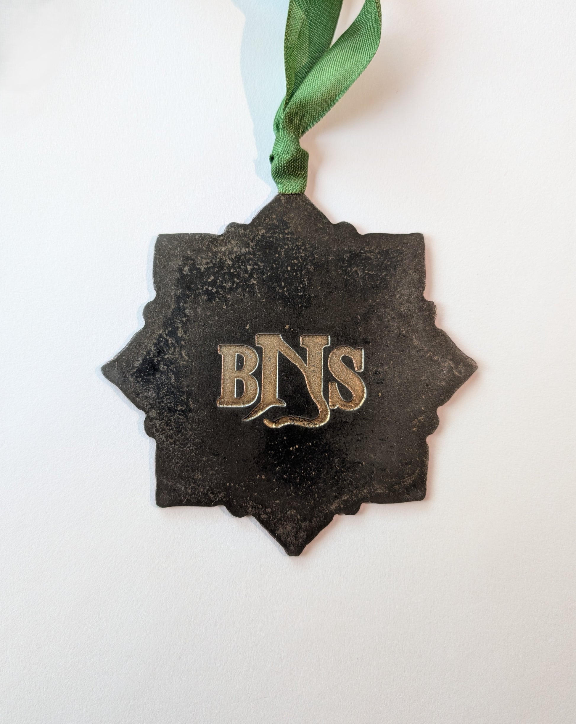This Holiday Ornament is made from steel, electro-etched, then painted. It is supplied with a green ribbon for hanging and display.